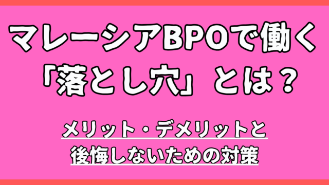 マレーシアBPOで働く「落とし穴」とは?メリット・デメリットと後悔しないための対策 マレーシア在住8年、BPOで働く日本人を見てきた私視点で就職のリアルを徹底解説。営業職より高い給与や豪華生活の裏にある「1年契約の縛り」や「キャリアの行き止まり」という落とし穴とは?海外転職で後悔しないための出口戦略とリスク対策をお伝えします。 2025.12.28 海外転職